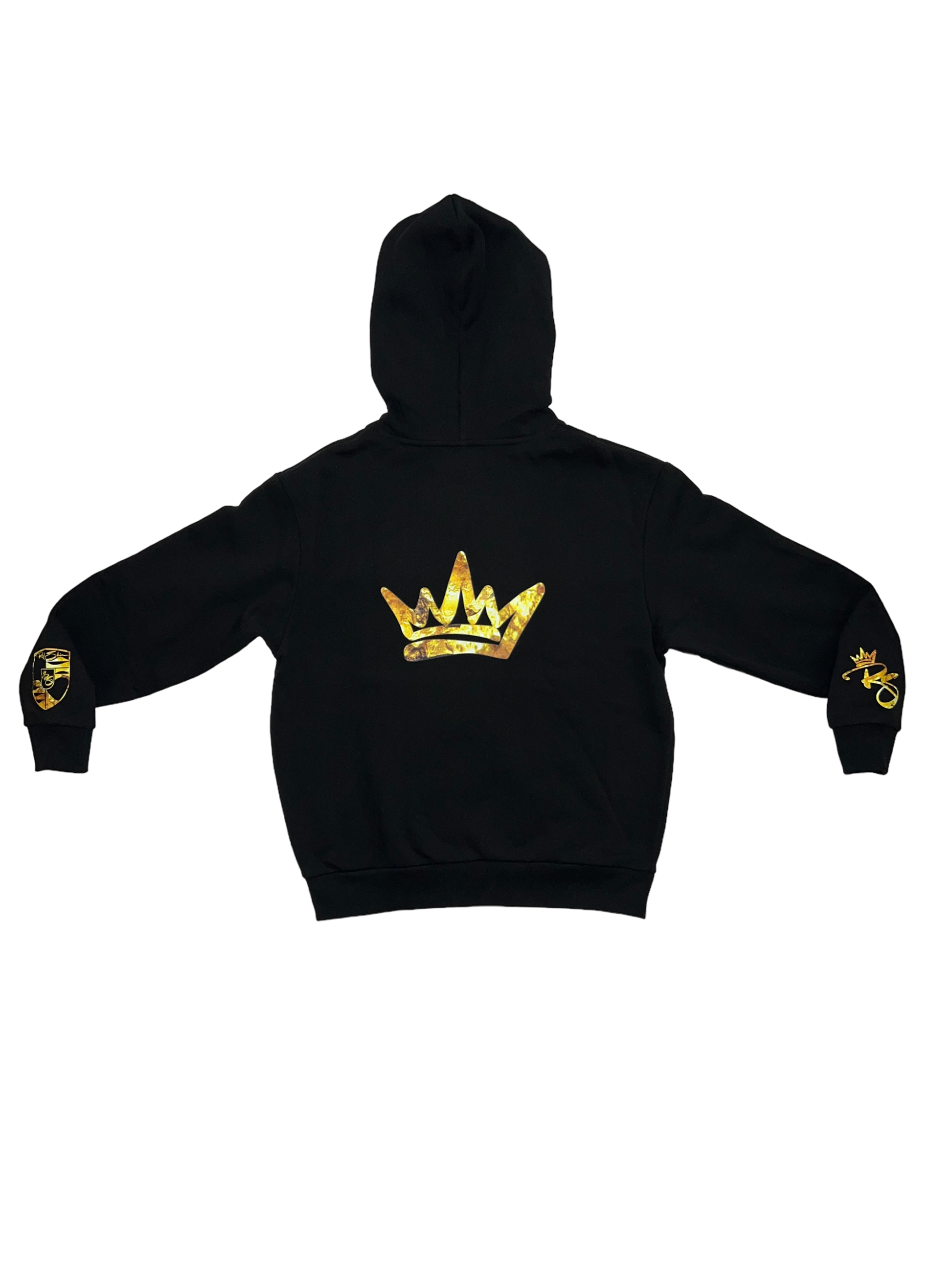 Featuring a sleek, drawcord-free neckline and a striking gold-tone finish, each piece is adorned with an emblematic crown design on the back, symbolizing the royalty we aspire to embody. This limited edition hoodie isn't just apparel, it's a declaration of style and stature.