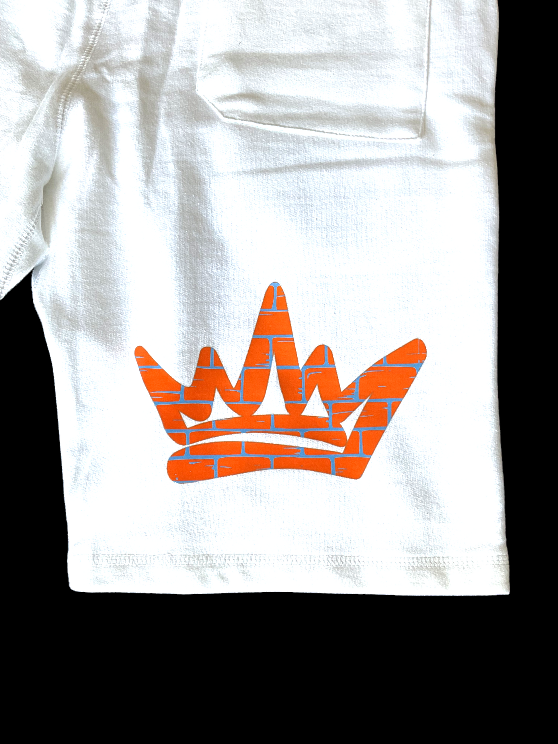 Discover our Limited Edition 'Royal Skin' Shorts, crafted for comfort and style with 80% cotton and 20% polyester. Featuring a vibrant orange hue with sky-blue brick accents, these shorts include convenient front and back pockets and are adorned with a subtle crown emblem. Perfectly capturing Florida's vivid style, they're a unique statement in your wardrobe.