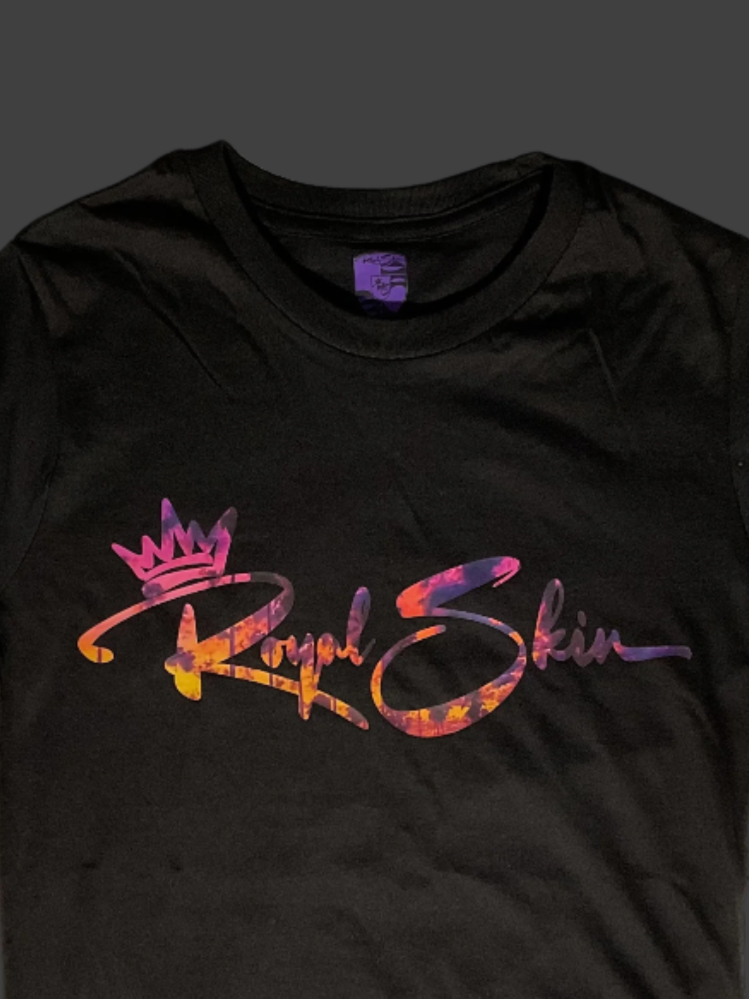 Feel the warmth of a Miami sunset with this ultra-soft 100% ring-spun cotton tee. Featuring a paradise-inspired backdrop with palm trees and the bold 'Royal Skin' design, it captures the essence of relaxed luxury.